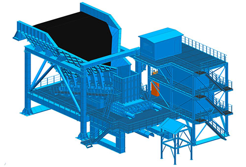雙齒輥半移動(dòng)破碎站用于千萬(wàn)噸級(jí)以上大型露天礦原煤及剝離物的初級(jí)破碎,其開采工藝一般為單斗挖掘機(jī)—運(yùn)輸汽車—半移動(dòng)破碎站—膠帶機(jī)。利用汽車運(yùn)輸?shù)撵`活性,縮短了汽車運(yùn)距,又發(fā)揮了帶式輸送適用于長(zhǎng)距離運(yùn)輸、生產(chǎn)率高、成本低、維護(hù)量小、安全可靠的特點(diǎn),同時(shí)可隨開采推進(jìn)定期遷移,機(jī)動(dòng)靈活。